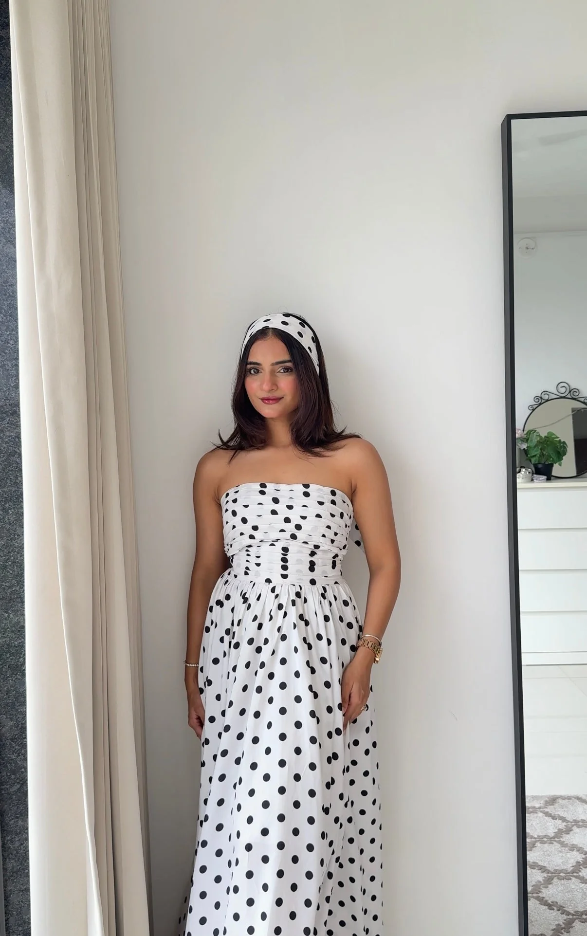 Designed with a fitted bodice and a flowy silhouette, the dress creates a flattering, feminine shape that feels both classic and modern. The timeless black and white polka dot pattern adds playful charm, while the strapless neckline brings an elevated, elegant touch. The matching scarf or hairtie lets you style the look your way for added versatility.