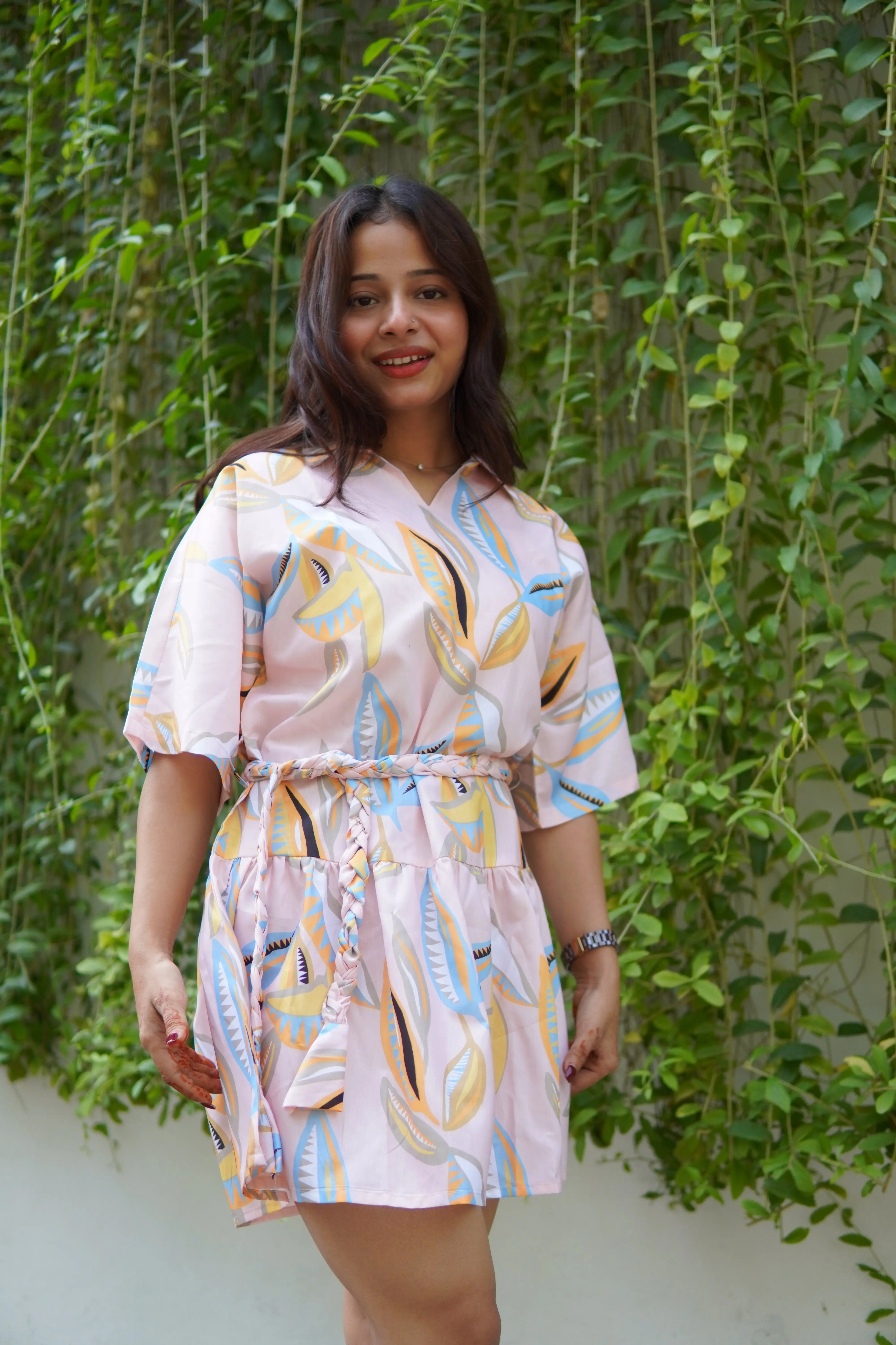 Turn up the charm with our Stella Glow Dress — a cheerful peach colour mini dress that’s as vibrant as your energy. Featuring a bold multicolor leaf print in hues of yellow, blue, and beige, this dress blends comfort with statement style.